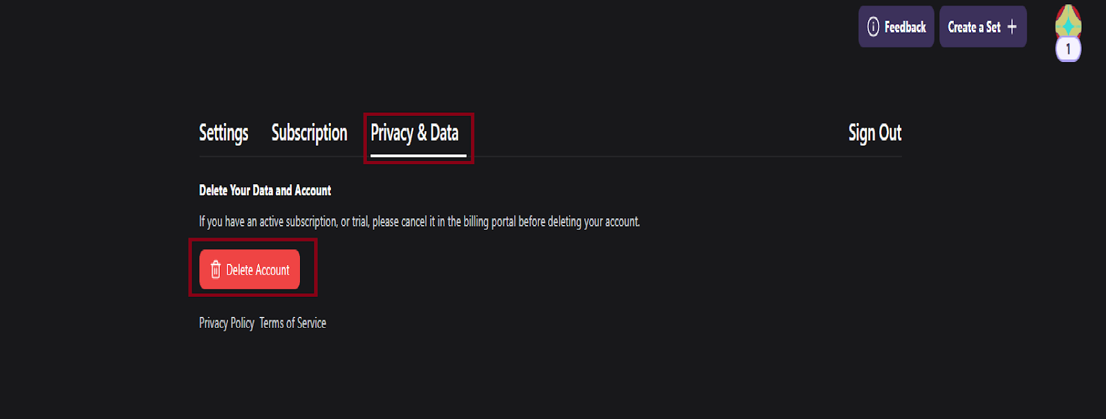 - Within the “Privacy and Data” section, you will find the option to delete your account.